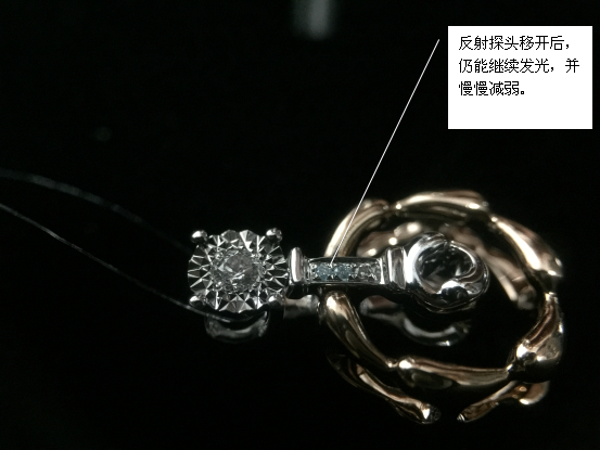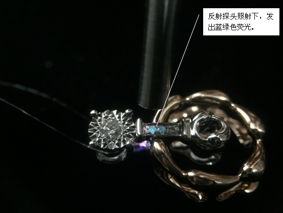 近期在使用紫外-可見(jiàn)光纖光譜儀對(duì)樣品進(jìn)行日常鑒定的過(guò)程中,發(fā)現(xiàn)配鑲的厘石碎鉆中有兩顆的熒光極強(qiáng)。而且,當(dāng)反射探頭離開(kāi)樣品的時(shí)候,出現(xiàn)了明顯的磷光現(xiàn)象,這點(diǎn)非常符合無(wú)色HPHT合成鉆石的特征。通過(guò)近一步的檢測(cè)確認(rèn)這兩粒配石就是HPHT合成鉆石。